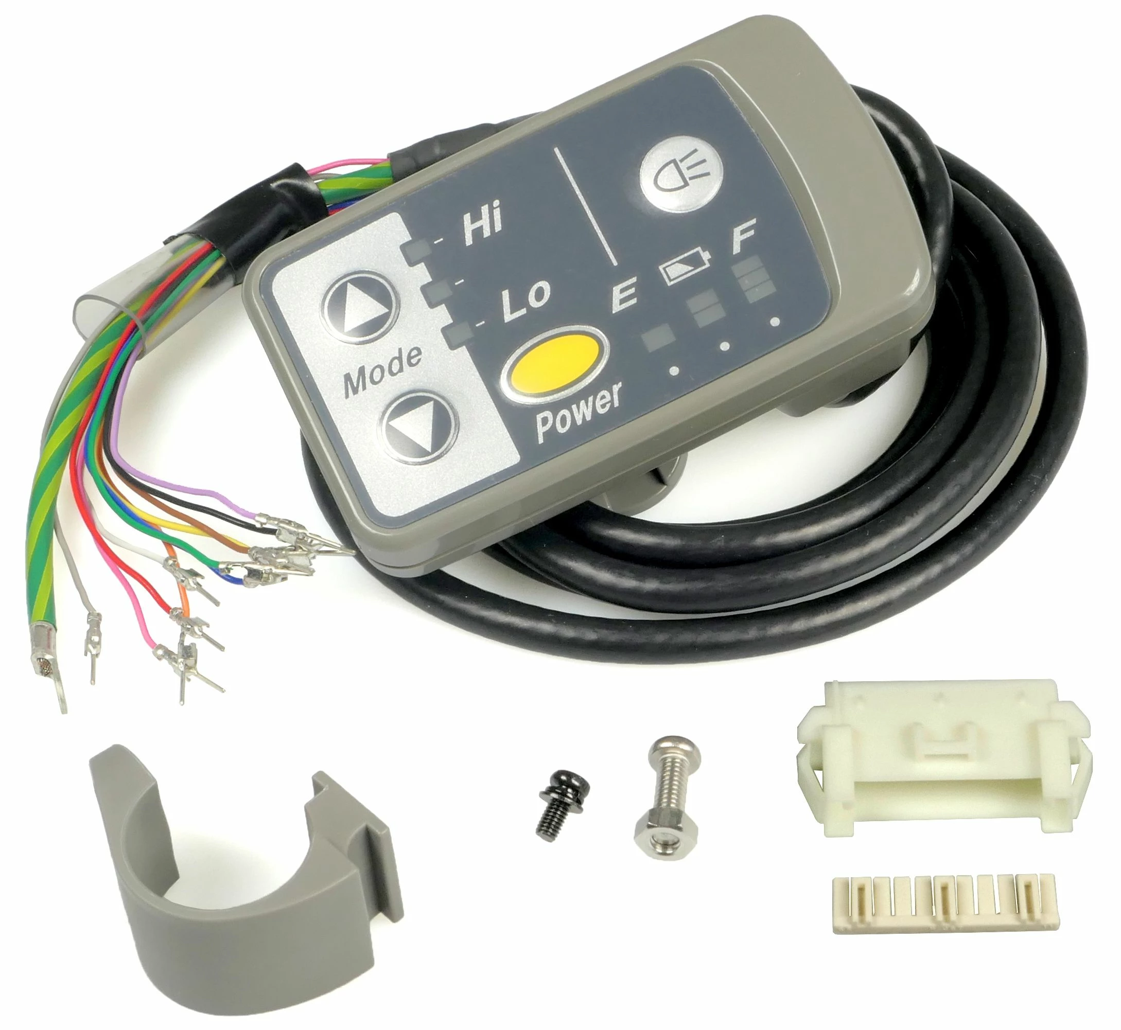 Cet écran vous permet de contrôler le moteur Panasonic Premium 26 Volt de votre vélo électrique Flyer. Facile à utiliser, cet écran LED Panasonic Premium 26V est doté d’un rétroéclairage & indique le niveau de charge de la batterie. Il vous permet par ailleurs de naviguer entre 3 modes d’assistance et d’allumer/éteindre votre éclairage. Le connecteur fourni avec l’écran LED dispose d’une prise à 11 pôles, disposés en ligne les uns à côté des autres.
