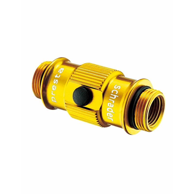 Tube principal et principaux composants en mĂ©tal, tuyau flexible souple dont la tĂŞte s’adapte aux valves Schrader et Presta par simple retournement.Â