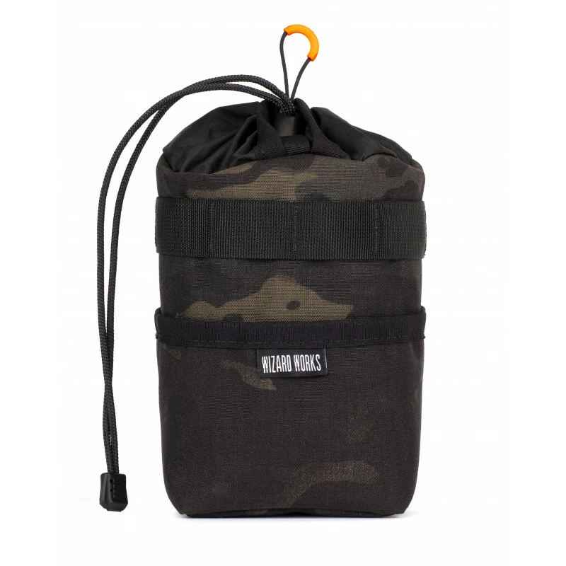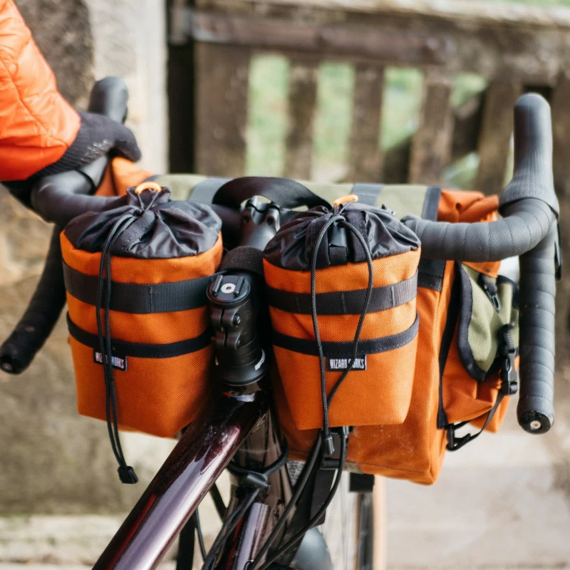 Sacoche de potence de la marque anglaise Wizard Works. Se fixe à l’aide de straps sur le guidon et la potence. Une sacoche qui permet de mettre de la nourriture ou une gourde.