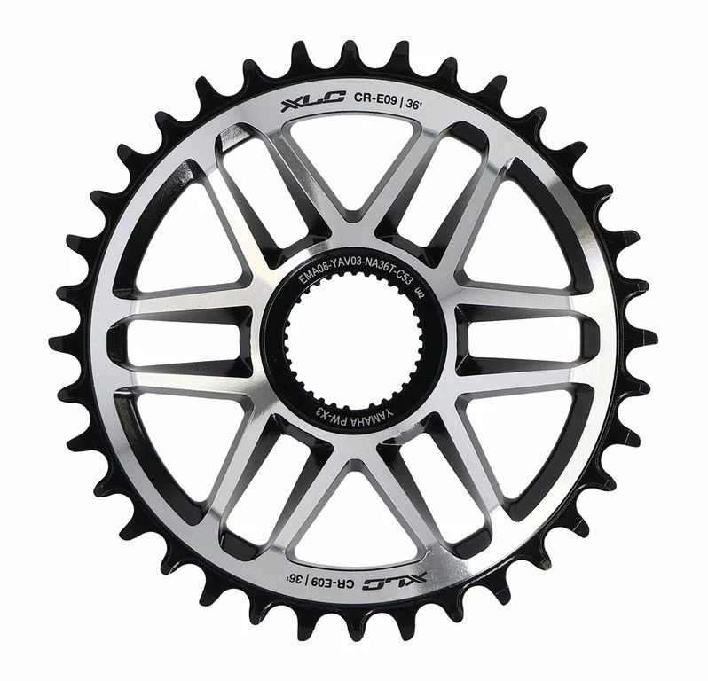Plateau XLC CR-E09 usinĂ© CNC pour les vĂ©los Ă©lectriques avec moteur Yamaha PW-X3. Plateau Direct Mount en alliage d’aluminium. Disponible en 36 ou 38 dents.